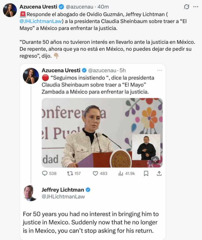 “Durante 50 años no le interesó llevarlo ante la justicia en México. De repente, ahora que ya no está en México, no puede dejar de pedir su regreso”, dijo Lichtman en relación a las declaraciones de la mandataria Sheinbaum Pardo en la conferencia matutina.