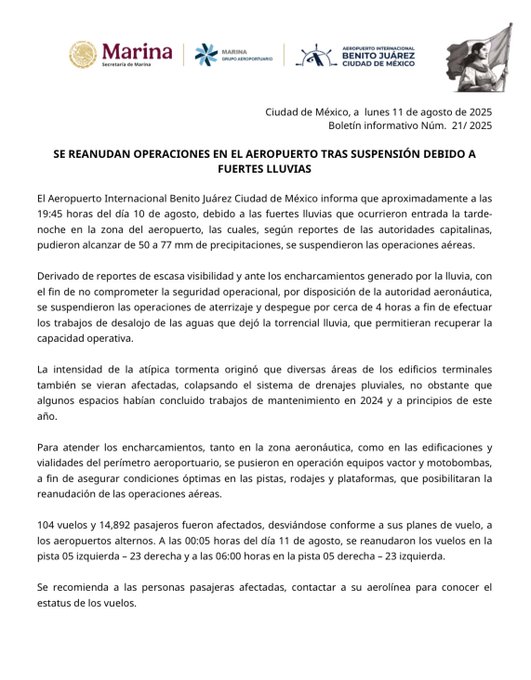 El Aeropuerto Internacional Benito Juárez Ciudad de México (AICM) reanudó operaciones durante la madrugada del 11 de agosto, luego de suspender por alrededor de 4 horas los aterrizajes y despegues debido a fuertes lluvias que afectaron la zona.